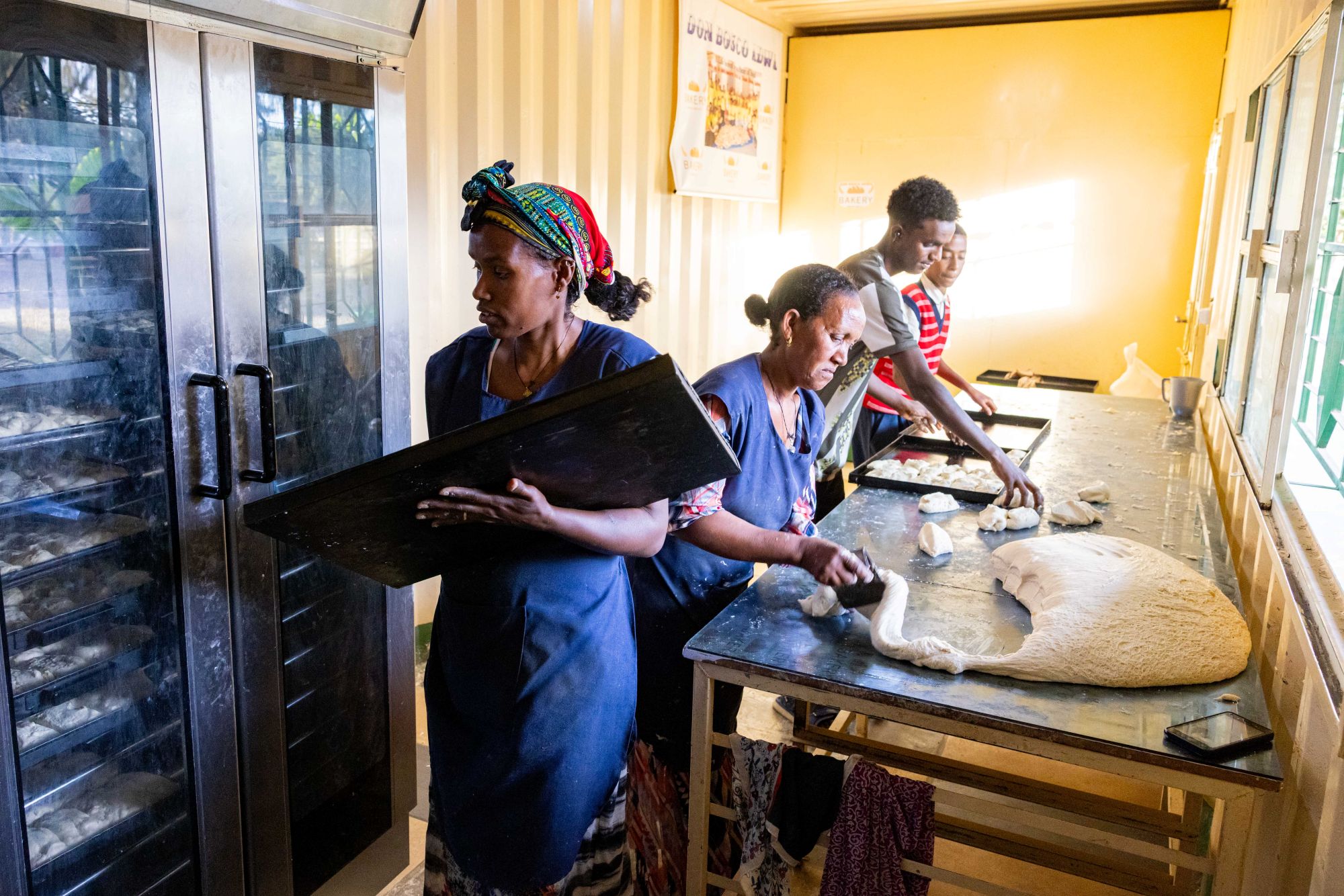 Damit ist der Takt vorgegeben. Im selben Tempo geht es weiter. „Am besten gleich runter zur Bäckerei“, meint Father Luan, „dann erwischen wir dort noch die Frauen.“ Auf geht die Tür, der Blick schweift über den Campus der Salesianer: feingestutzte Hecken, in voller Blüte stehende Bougainvilleen, Kieselwege – ein Hauch von „Club Med“ mitten in Äthiopien. Das ist Father Luans Reich, sein Bollwerk gegen das Chaos dort draußen. Und dann die Geschichten dahinter. Blitzblank die Bäckerei, mit Frauen am Ofen, bei denen jeder Handgriff sitzt. 5.000 Stück Brot backen sie jeden Morgen. Sie alle sind Opfer eines brutalen Krieges, der fern der Weltöffentlichkeit bis vor zwei Jahren in der Region Tigray tobte, Hunderttausende tötete und Millionen vertrieb.