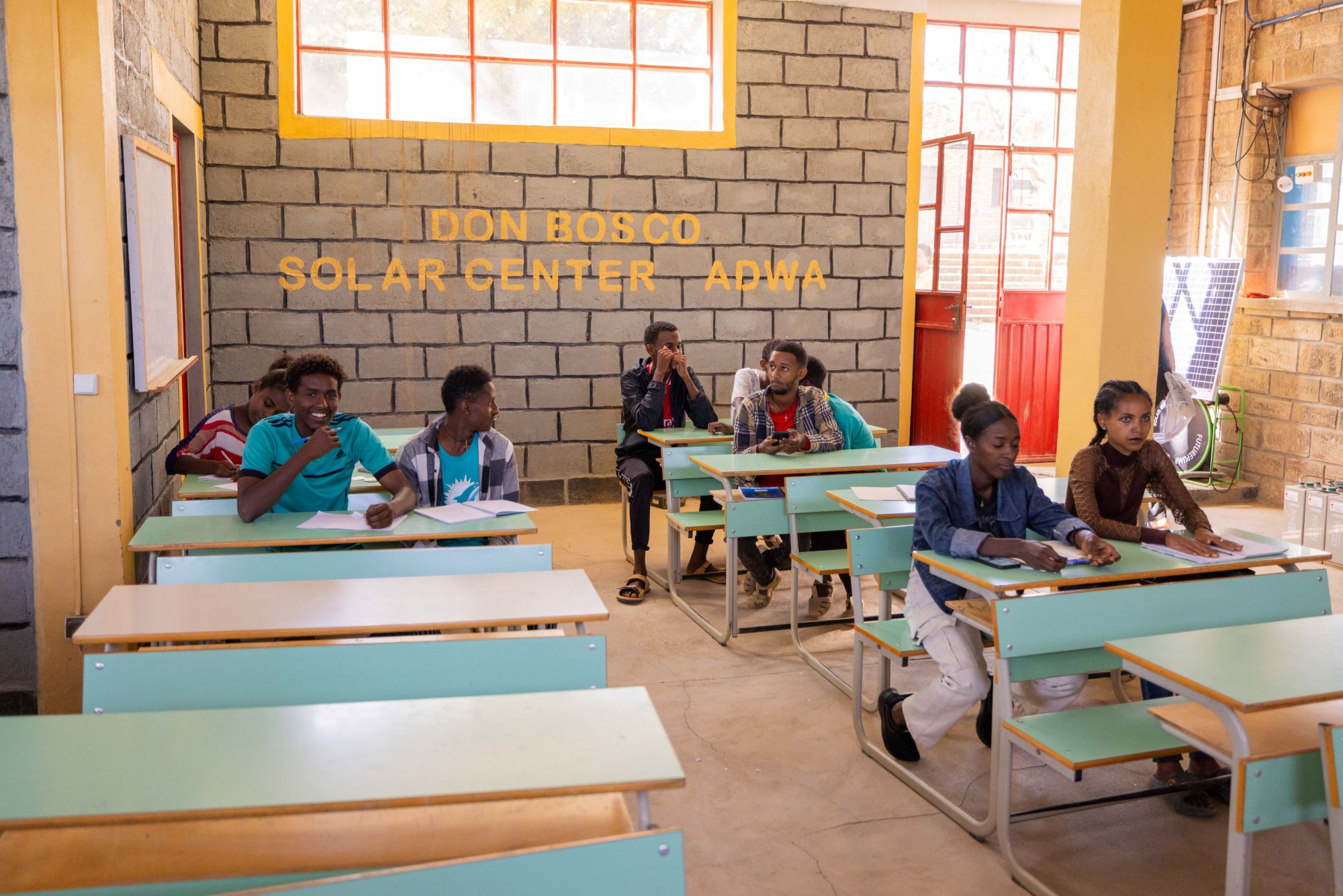 So ist er gerade daran, das einzige Trainingszentrum für Solarenergie in Tigray aufzubauen. Weshalb er schon frühmorgens besagten 300.000-Dollar-Plan kalkulierte. Einmal, als er zumindest zu Mittag ein Nickerchen hielt, bekam er nach dem Aufwachen Lust auf ein Eis. „Ich suchte also auf YouTube Videos, wie man sowas selbst herstellt.“ 15 Minuten später trommelte er seine Leute zusammen und schon am nächsten Tag ging Adwas einzige Eisproduktion in Betrieb und macht seither gute Gewinne, die ihm dabei helfen, andere Programme zu finanzieren. Etwa drei Psychologinnen, die Menschen aus ihren Kriegstraumata führen. So geht alles bei den Salesianern ineinander über: die Ausbildung für die Jungen, das Training für die Opfer des Krieges, die Betreuung von deren Kindern in der hauseigenen Krippe.